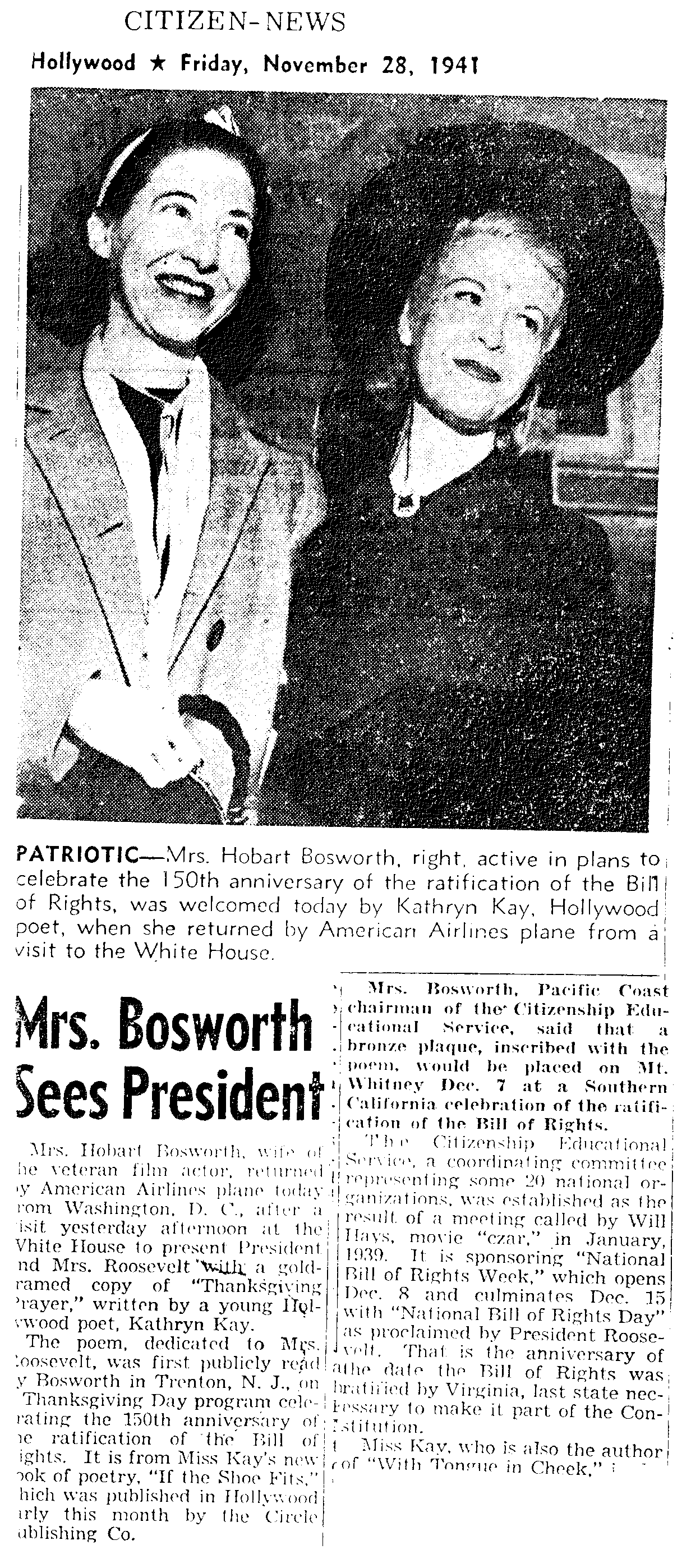 The poem, dedicated to Mrs. Roosevelt, was first publicly read by Bosworth in Trenton, N.J., on a Thanksgiving Day program celebrating the 150th anniversary of the ratification of the Bill of Rights. It is from Miss Kay's new book of poetry If the Shoe Fits which was published early this month by the Circle Publishing Co.