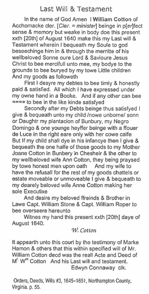 William Cotton's early life and the circumstances of his appearance in the New World are not well known. He was apparently born 18 Nov 1609 in Bunbury, Cheshire, England. William Cotton's will named Joane Cotton as his mother, and his former home was Bunbury, Cheshire, England. The Bunbury parish register lists a William Cotton as being baptized 18 March 1609/10 (i.e. 1610), son of Jeffry (or Jeffray or Geffray) Cotton. Other children of Jeffry and Joane were Peter (b. 1607), John (b. 1613), Elizabeth (b. 1615, died in infancy), Elizabeth (b. 1616/17), and Richard (b. 1622).