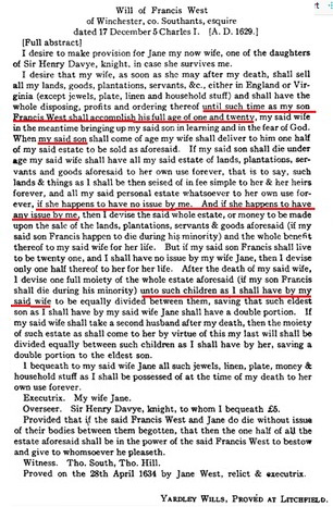 | 2. ID=LCQ3-2LM 3. ID=LCV5-77K. Not Francis John West, b 1632 in Duxbury MA (m Susanna Soule) and not b 1608 in Eng. 4. ID=MN2N-TQK or LCV5-77Y 5. ID=9V9X-YCF. Came to Jamestown in 1608 before his brother Thomas, Lord Delaware, came 1610. 6. ID=KHMZ-SM9. He had 3 wives: (1) m 1626 Margaret had son Francis; (2) m 31Mar1628 Temperance Flowerdew d Dec1628, widow of Governor George Yeardley; and (3) Jane Davye, m 1629. Margaret was a 3-time widow: of ?, of William Powell (1540-Jan1623) dau Alice (1621-1669), and of Edward Blayney (1595-1626). 9. ID=?. Son of Capt. Francis and Margaret, b 1627. Not known to be father of #3; probably another generation here [JPP]. |