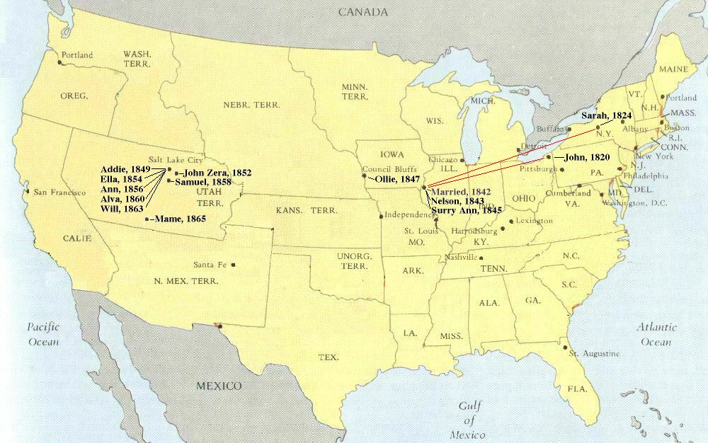 John Alger was born in Lebanon (now New Lyme), Ohio in 18240. Sarah Ann Pulsipher was born in Spafford, New York in 1824. They married in Nauvoo, Illinois in 1842. Their first two children were born in Nauvoo: Nelson in 1843, and Surry Ann in 1845. Ollie was born at Winter Quarters in 1847. Then Addie was born in Salt Lake City in 1849. John Zera was born in Parley's Park (now Park City) in 1852. Then Ella was born in Salt Lake in 1854, and Annie in 1856. Then Samuel was born in Payson in 1858. Then Alva was born in Salt Lake in 1860, and Will in 1862. Finally, their last child Mame was born in Hebron in 1865. Both John and Sarah died in St. George.
