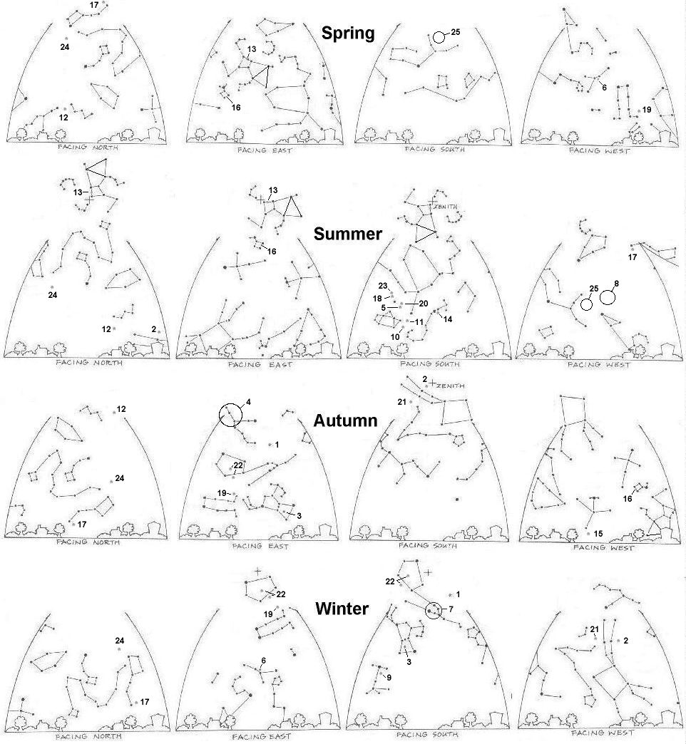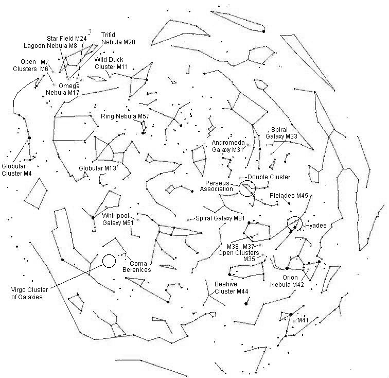 This map is a circular projection of the sky centered on the north celestial pole. Near the center of the map the constellations are not distorted, but at the edges (near the southern horizon), they are. Below are 16 pictures of the sky taken from Janice VanCleave's Constellations for Every Kid. They show how the constellations actually look in each direction in spring, summer, autumn and winter. The exercise is to correctly identify these 25 objects for binoculars or small telescopes by referring to the circular map. If you are going to memorize them, learn them in the order of the numbers. Numbers 1-12 are essential, they are all very good in binoculars. The last 13 mostly require a small telescope.