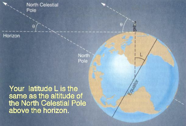 Find the North Star by using the Pointers of the Big Dipper. Sight along the edge of the quadant to the North Star while tipping the quadrant slightly so that the weight hangs freely. When the weight stops moving, slowly tilt the quadrant to be vertical and press the thread to the quadrant and hold it and read the scale to 0.1° (The smallest marks are 1/4 °). Record that measurement, and then make 7 more measurements, and record them for a total of eight. Now discard the first three measurements as practice (or any three which are way out of line with the others). Calculate the average of those five observations, and enter them and their average here. That should be very close to your latitude (see illustration.)