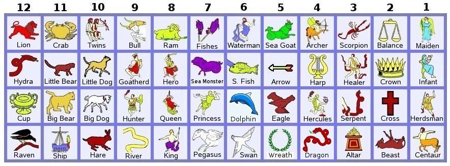Interactions and shared stars were used to arrange the rows of each column. The Maiden is identified as the virgin queen holding the Infant who grows up to be the Herdsman (Bootes). All eight constellations adjacent to the Cross have interaction with it (such as Moses, a Herdsman, putting the serpent on the Cross). The Centaur is slaying the Beast (Lupus) which is sacrificed on the Altar (Ara). The Healer (Serpent Bearer, Ophiuchus) is crushing the head of the Scorpion. The Serpent (Serpens) is reaching for the Crown (Corona Borealis). The Healer (Hermes) invented the Lyre (Harp, Lyra). Hercules is crushing the head of the Dragon (Draco) and wins the Wreath. The Dragon is identified with the Serpent which in turn is identified with the Scorpion (both having heads crushed). The Archer is shooting the Arrow (Sagitta). The Eagle (Aquila), Swan (Cygnus), Dolphin (Delphinus) and Pegasus all fly in the heavens area (north of zodiac). The Dolphin is a transition from fish (in watery underworld below the zodiac) to birds above in the heavens, so it between the Southern Fish (Piscis Austrinus) and the Swan. The Waterman (Aquarius) is pouring water onto the Southern Fish. The bands of the Fishes are connected to the Sea Monster. That monster is also part of the myth of the Hero (Perseus), Princess (Andromeda), King (Cepheus) and Queen (Cassiopeia). The King and Queen are the parents of the Princess and so are adjacent to her, and the Hero kills the Sea Monster so they have major interaction. The Big Dog (Canis Major) and Little Dog (Canis Minor) belong to the Hunter (Orion) and together they hunt the Hare (Lepus). The River (Eridanus) begins at the foot of the Hunter where they share the bright Star Rigel. The Big and Little Dogs may correspond to the Big and Little Bears. And finally, the Lion (Leo) is crushing the head of Hydra, the Fleeing Serpent, and the Cup (Crater) and Raven (Corvus) both share a star or two with her back.