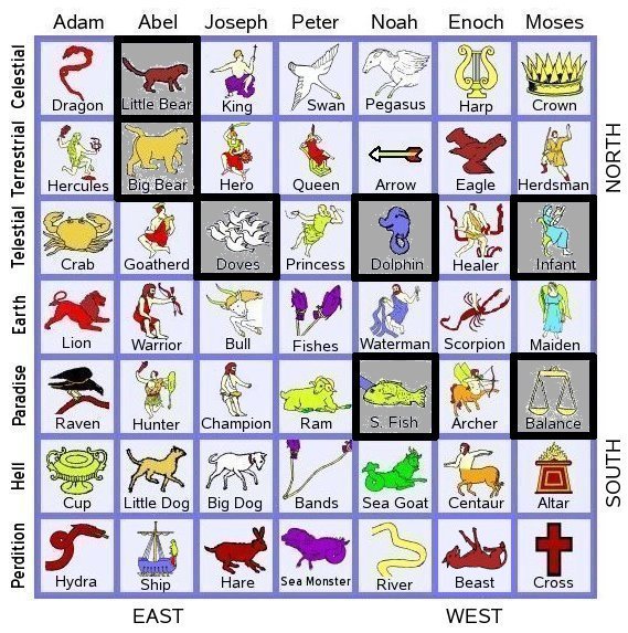 Each column of seven constellations is associated with one of the seven chief angels and each row with a different level of spirituality. Each one of the seven constellations is either feminine or a fish. Women often represent spirituality and can represent male priests or angels. The fish is often symbolic of a church. Thus, they all also fit the pattern that they may represent priesthood leaders or spiritual groups.