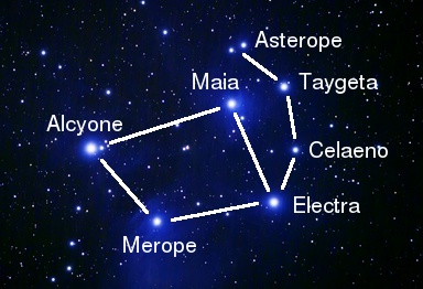 It has a clearly visible rectangle formed by four of its brightest stars. Novice star gazers sometimes mistakenly think this beautiful little cluster is the Little Dipper. As shown in Figure 10, the other three stars form a little string which can be thought of as attached to one corner of the square. Two of these stars (Asterope and Celaeno) are too dim for most to see. There is a sixth visible star to the left of those shown which represents Atlas, who is the father of the seven sisters. It is not clear to me who identified exactly which stars have which names, but what is shown are the accepted designations. Nevertheless, this little star cluster has been recognized by nearly every ancient culture and nearly always said to have seven stars.