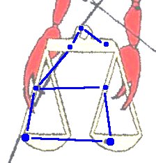 In my work, I have restored a picture of the balance where it is being held in the grasp of the scorpion. It has exactly seven stars, with the two bright ones in the trays. That number of stars was chosen long before the idea for this article arose. It was chosen because there are indeed seven stars in that area. The balance fits neatly between the scorpion's claws. It is composed of four stars nearly in a square and three in a row that go to the upper part of the balance. It is shown in Figure 16. Note that four of the stars are nearly on the ecliptic circle which is the apparent path of the sun, moon, and planets through the starry background.