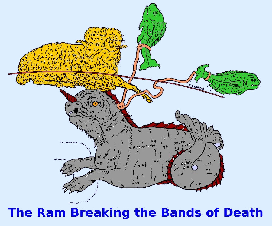 Before continuing, let us note that in an earlier paper the Sea Monster was identified as the great monster "Death" (2 Nephi 9:10), attached to which are two bands securing the two fishes of Pisces (the Fishes). Aries (the Ram) is extending his right foreleg across the bands, apparently breaking the Bands of Death (see Figure 4).[9]