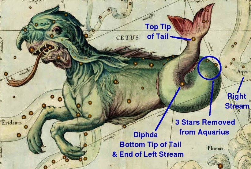 Again looking at Figure 1, the left stream ends in the star ω Aqr (omega Aqr). That is neither a bright star nor anywhere near being under the tail of Cetus. That is a huge clue that someone cut off part of that left-hand stream.