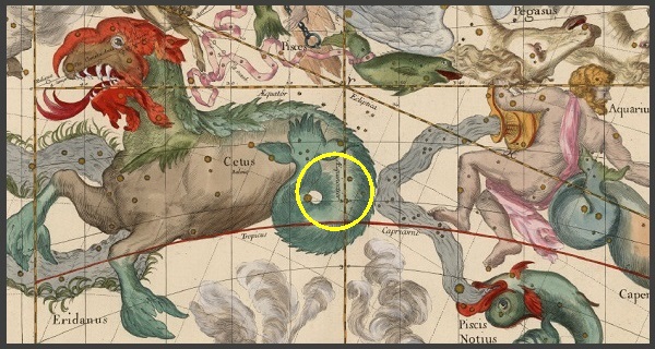 If we continue the left stream through those three encircled stars, we come the the very brightest star in the constellation of Cetus: Diphda, designated β Cet (beta Cet). Ptolemy lists it as the southern tip of the tail of Cetus. It seems clearly to be the bright star Aratus described as ending the left stream because there is no other in the vicinity. It is also called Deneb Kaitos, meaning "tail of the whale". The tail of the Sea Monster as described by Ptolemy ends in two points (bilobed) like most fish. Diphda is the star at the very tip of the southern lobe of the tail. The star at the tip of the top tail lobe is also indicated in Figure 3.