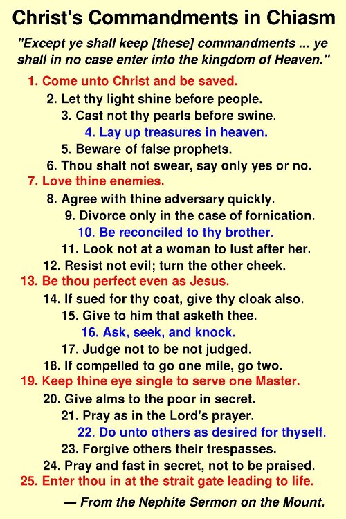 Figure 1 illustrates my attempt to find all of the commands in the Nephite Sermon on the Mount and summarize them briefly in a list. They are rearranged somewhat from the order given into a new pattern which is here dubbed a "zig-zag chiasm" to make them easier to memorize if desired. That means they are arranged in related pairs around the blue lines. For example numbers 14 and 18 say similar things, whereas 17 explains why we sometimes fail at 15. The more important are in red and those second in importance are in blue. Of those in red, 13 at the center is the most important, whereas the first and the last (1 and 25) are tied for second, again paired by expressing similar concepts.[4]