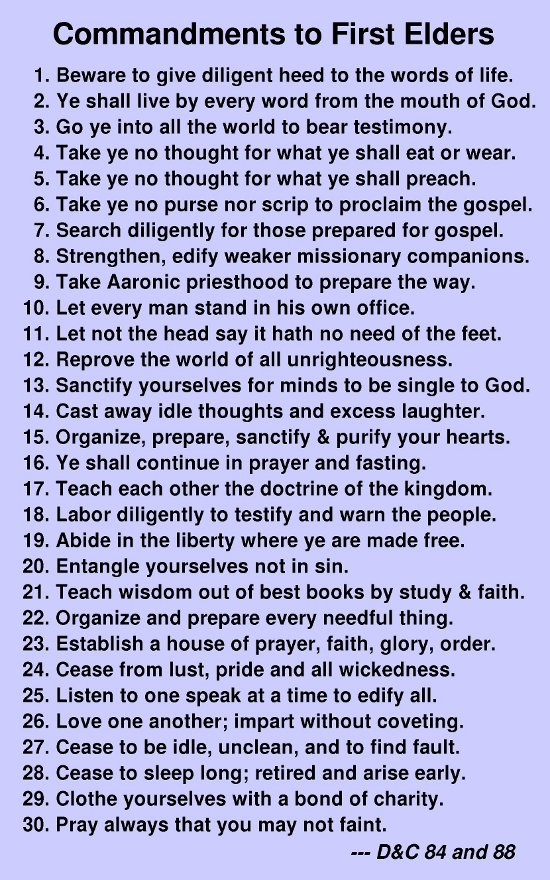 Let us consider a set of commandments which was given to a group of at least seven elders. In the revelation they are referred to as the "first elders" and also as the "friends" of Jesus Christ, as were his apostles during his mortal ministry. Each of these men had been ordained a high priest. To the best of my understanding, these seven were the "first elders" in the sense that they were either among the first baptized or were indeed the very first seven baptized and ordained elders.[7] Some of them had been called on missions and were just returning from the Eastern States. Earlier in the Church there were very few high priests; they were ordained principally to be either bishops, in stake presidencies, or on a high council. Thus, the modern equivalent of those for whom these missionary-preparation higher commandments were given would probably be mission presidents, area presidents and apostles.
