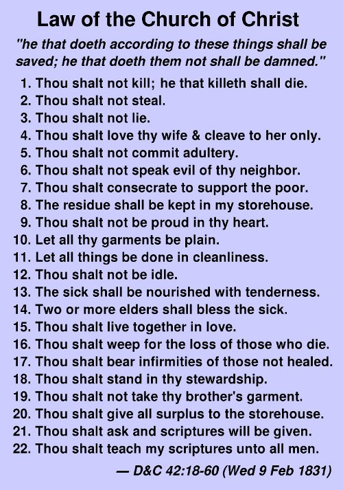 The laws given to the Church tend to fall into two categories. The first are identical to the Ten Commandments. We tend to see those and say, as did the rich young man, that we have kept those from our youth. But when the youth asked what he yet lacked, he was told to sell all he had and give to the poor (Matt. 19:20-21). That is very similar to the new law given to the Church. It does not require selling everything, but it does require giving all surplus to the poor and to the Lord's storehouse to give to the poor later (Laws 7, 8 and 20). Are we not very similar to that youth who departed feeling bad because he was rich and that was too much of a sacrifice?