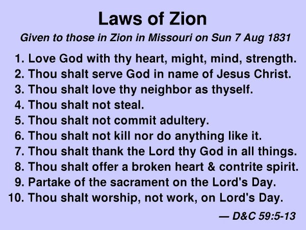 The first example of different laws being given to a group was the set of ten commandments given to the little group called to begin to found the city of New Jerusalem in the land of Zion. They prayed to know what law the Lord would have them live, perhaps anticipating that it might be a higher law than had been given earlier to the entire Church. The commandments they were given are summarized in Figure 3.