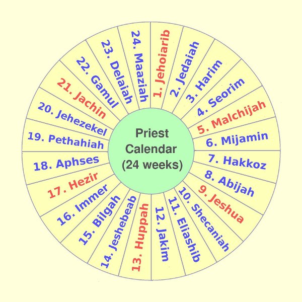 The only article in my earlier work about the Priest Calendar establishes certain basics features, so they will only be briefly repeated here.[1] The Lord told King David to cast lots to put in order 24 priestly families who were descendants of Aaron (1 Chron. 24:7-18). Aaron was the brother of Moses who had headed the Aaronic Priesthood (his namesake) for doing service and ordinances in the holy temple which David's son Solomon would build. Each of those families would then preside for one week, with the new family taking over each Saturday at noon.