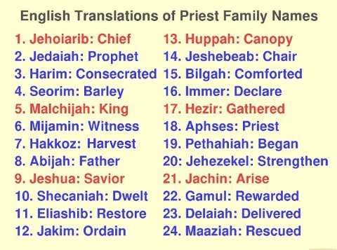 Table 1 presents an English translation of each of the 24 family names. The translations were not done with the target of representing a known role of the Savior but are in most cases to be simply an accurate translation of the names. In some cases a little understanding of the symbolism may be required. For example, the fourth name Seorim means "Barley Grains" which is what was offered as the first fruits of the ground during the Passover week. It might have been translated "Firstfruits", but it was left as "Barley" hoping the reader would remember the connection. Similarly the sixth name Mijamin refers to the right hand, but it is used religiously to mean "Witness" so that was the choice. And the seventh name Hakkoz literally means "The Thorn" but comes from a root meaning "Harvest". In every case an attempt was made at the best possible translation of the intended symbolism.