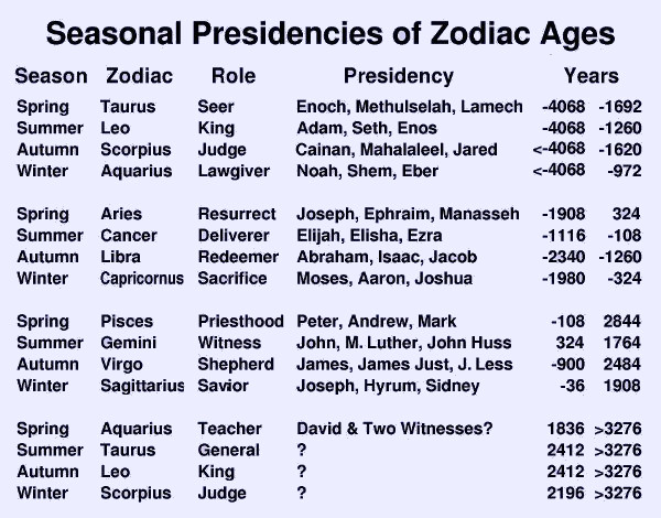 As shown in Table 1, each of the constellations associated with these three patriarchs is represented in the first age: Leo (Adam) is summer, Scorpius (Enoch) is autumn, and Aquarius (Noah) is Winter. Thus, it seems like a "no-brainer" to align those patriarchs with those seasons. But wait, what about the fourth one? Taurus the Bull is associated with Joseph Smith, but he does not live in that age, so that won't work as a general rule if we keep the rule of living in the age presided over.