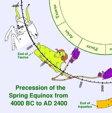 This all leads to the concept of world ages defined by what zodiac constellation the sun is in on the first day of spring. From about 4000 BC to 2000 BC it was in the Taurus the Bull. Look at Figure 3. The sun at the spring equinox was about a quarter of the way through the Bull on its way to the Ram. That means this illustration represents about 3500 BC. Then follows the Age of Aries, the Ram, from about 2,000 BC to 1 BC. Next comes the Age of Pisces from about AD 1 to AD 2000, and finally the Age of Aquarius. Hence all the hype about the Age of Aquarius beginning is because it is now about AD 2000. There has been great uncertainty in just when these ages begin and end because the constellations seem to have ill-defined or non-existent natural boundaries. Notwithstanding such uncertainty, this article attempts to pinpoint the beginning and end of each zodiac age to the very day.