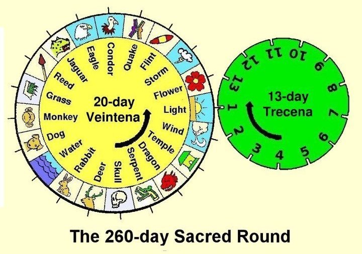 The Sacred Round consists of a fixed cycle of 260 days which in turn is made up of two shorter cycles: a trecena of 13 days numbered 1 to 13 and a veintena of 20 days each of which has a picture associated with it. The first day is 1 Light, followed by 2 Wind and then 3 Temple (see Figure 3). After 13 x 20 = 260 days the cycle begins to repeat. It never inserts a leap day, so it is a powerful tool for dating because once one date has been established, all other dates in history are determined.