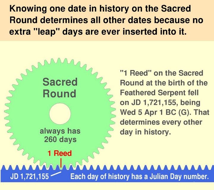Now that the 1 Reed correlation of our calendar to the Sacred Round has been discovered, let us see where the other dates proposed from the Bible fall on the Sacred Round. To appreciate them, we need to know that all dates with the numbers 1 and 13 are holy, and those with the pictures Light, Wind, Temple, Serpent, Reed, Eagle and Lord are major holy days.