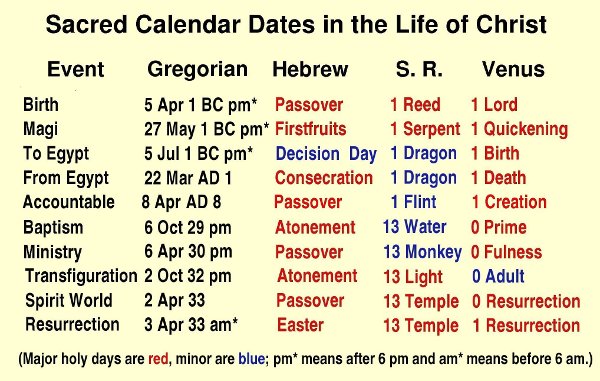 All of the events in the life of Jesus discussed so far also fell on holy days on the Venus Calendar. His birth was on 1 Lord, baptism on 0 Prime (which represents being spiritually reborn, which in turn is represented by baptism), His ministry began on 0 Fulness, the Transfiguration was on 0 Adult, and the Resurrection was on 1 Resurrection (as remembered by the Aztecs!). Thus, all of these events were on holy days and two of them (baptism and resurrection) were on the very day symbolized by the phase!
