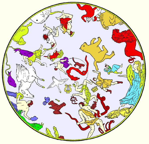 If one then projects the northern hemisphere of that globe down onto a plane it would look like Figure 2. The center of the circle is the north ecliptic pole and the red Dragon is the constellation which nearly surrounds it. The circle is the ecliptic which the sun appears to move around once each year as the earth orbits the sun. The symbolism of the stars is that constellations on the ecliptic represent the earth, those within that circle are in heaven and those outside the circle are in the underworld. Thus, the Dragon is located at the center of heaven.
