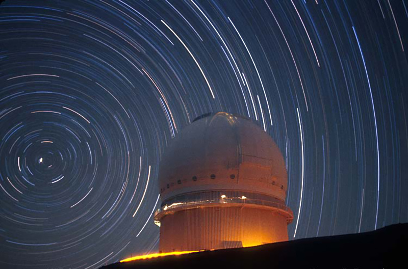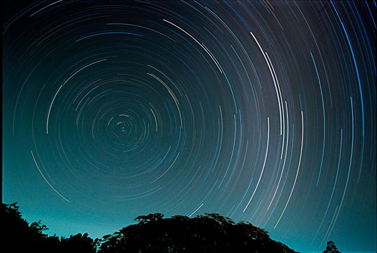 One operative word in that question is "clockwise" because north of the equator all of the stars seem to be rotating counterclockwise around a point in the sky which is due north. Flat-earth theory has attempted an explanation of the northern observation, but what about south of the equator? Figure 3 shows a photograph of the effect using an exposure of a few hours to record the apparent motion of the stars taken from Reunion Island in the Indian Ocean.