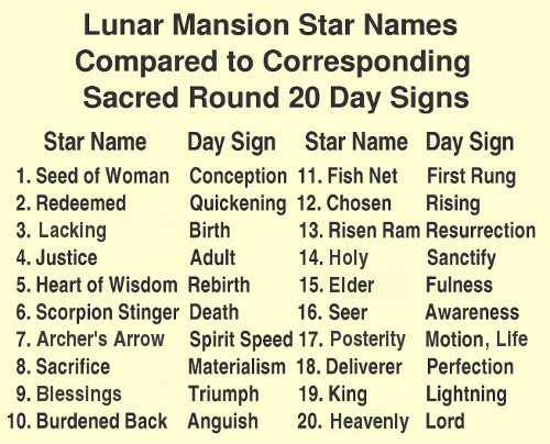 An unexpected discovery was also reported, namely, that there is a clear correspondence of the twenty day signs of the Sacred Round to 20 of the 28 lunar mansions. It is far beyond being a chance coincidence because several of the signs are nearly identical, such as Water and Water, but also because they are in the same order. More research is needed to explore the depth and implications of this relationship, but it clearly is yet another witness of the hand of the Creator.