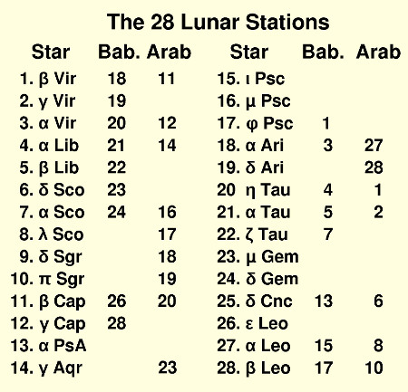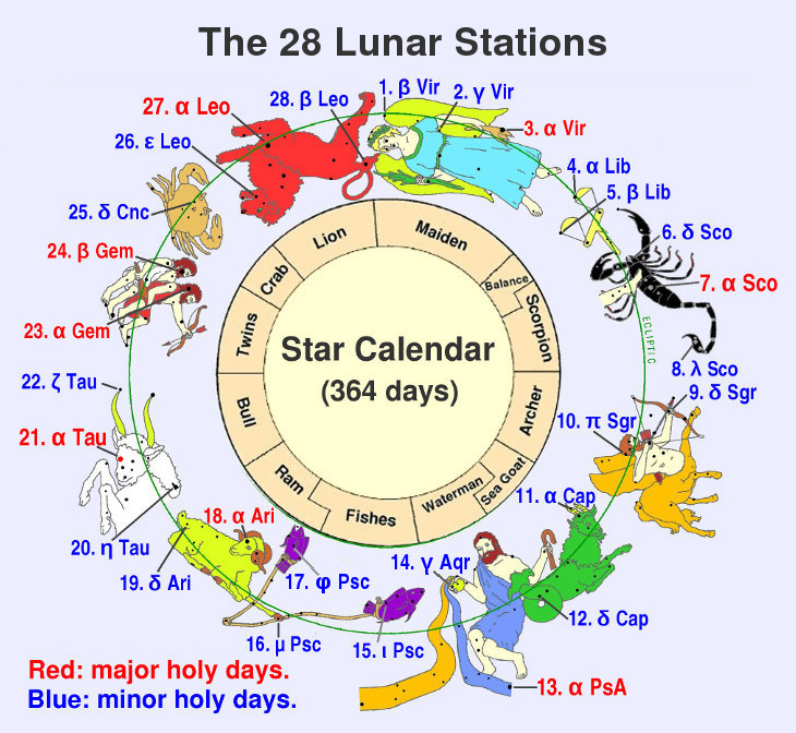 The apparent use of 28 lunar stations is to be a set of holy days on the Star Calendar[1] determined solely by star positions rather than merely set days of the year. It was noticed that many important sacred events occurred on star days that had been on the Babylonian and Arab lists. Thus, an attempt has been made to restore a correct list.