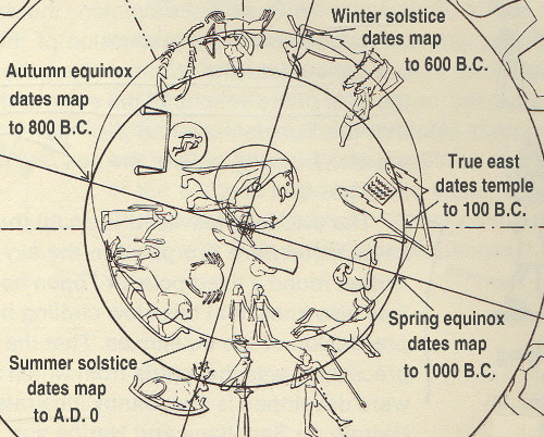 Let's not debate the accuracy of those circles which look good enough considering the rough placement of the figures. Let us simply apply the method of colure averaging to all four indicated values. It should also be noted that the dashed lines in Figure 11 parallel to the edges of the illustration indicate the orientation of the star map in the ceiling. It was suggested in the original work from which this illustration was taken that such is the case: the date by assuming the true vernal equinox at the time of building was true east indicates 100 BC. This indeed shows that the Egyptians at that time understood where the current spring equinox was.