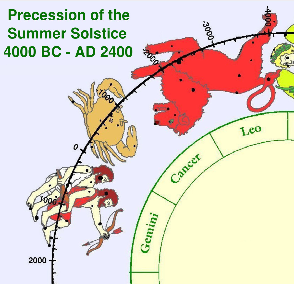 The 90° summer colure line points directly to a star! Look just above that star to the star slight above the ecliptic and one slightly below allows us to identify this star precisely as δ Cnc,[8] the star at the 800 BC point in Figure 8, which shows the scale for the precession of the summer solstice. Thus, we get another precise measurement which can be averaged with the first two.