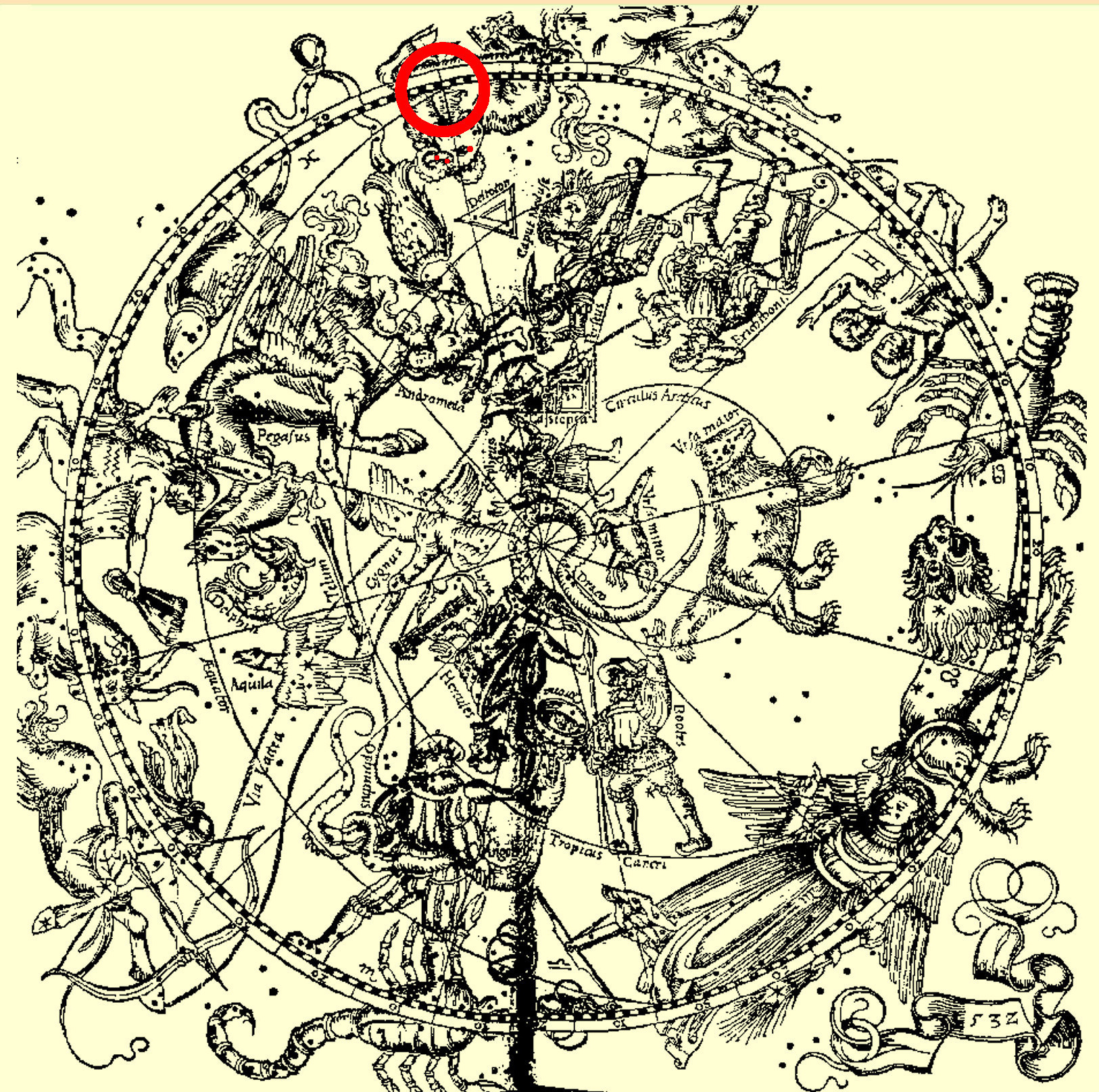 Again my answer is a footnote.[5] That answer is several hundred years BC, so many, in fact, that it is long before the Greeks who supposedly made the star position tables. There is a chance that the 1532 woodcut maker drew the circle at the wrong zodiac division line. If it was supposed to be at the next line 30° counterclockwise which runs through the back of the Western Fish of the Fishes (Pisces) rather than in Aries (the Ram), then the date would be 2,160 years later in AD 1560.[6] I suspect that is what happened, because the history is that Dürer's mathematician friend supposedly updated the star coordinates to be for their epoch.[7]