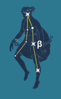 A second designation is the one used by astronomers to refer to a star. Orion's left foot is called β Ori, meaning its Greek designation in the constellation the Hunter, Orion (Ori). For those who skipped Greek in school, the third way to refer to the star is by abbreviating the Greek letter ("beta" in this case) in English with three letters: Bet Ori.