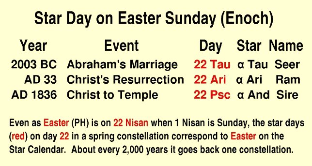As for Easter, it is usually an even brighter star on day 22 of those same months at those different dates, even as the Hebrew Easter is on the day 22 Nisan in similar years. Table 1 uses Easter Sunday on the Enoch Calendar because it only has a range of about 3 Apr to 13 Apr, rather than a full month as on our Gregorian Calendar (from 22 Mar to 23 Apr). If Easter is always on a Sunday, it has to have a range of at least a week in the solar year. Table 1 lists events on three Easter Sundays on the Enoch Calendar that happened about 2,000 years apart. These are events found in my Religious Chronology which have been published previously. The point of the table is not only some important events happened when the Enoch Easter coincided with the Star Calendar Easter, but the constellation changed from Taurus to Aries to Pisces!