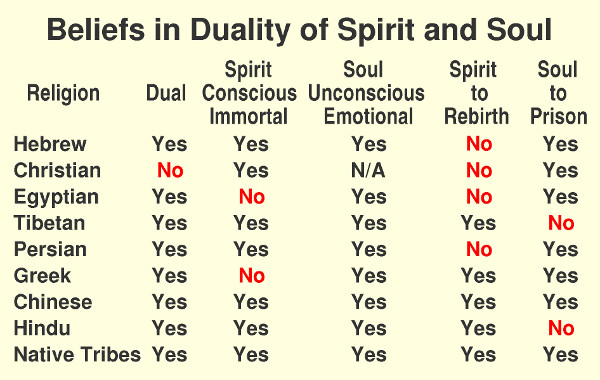 It is also noted that most other religions world-wide believe in this duality of spirit and soul and also have different names for these distinct parts. Many have no trouble believing in both of the contested ideas. That is, they believe that the spirit, after having a life review, usually reincarnates into another mortal existence with a new soul and new body, becoming a new person, whereas the former soul is sent to a prison of torture or correction in the underworld for having sinned.