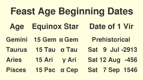 These feast ages also require more investigation. There are probably many mysteries hidden in the dates of both the equinox star eras and also the feast ages.