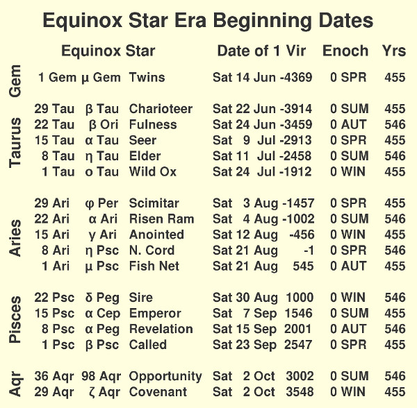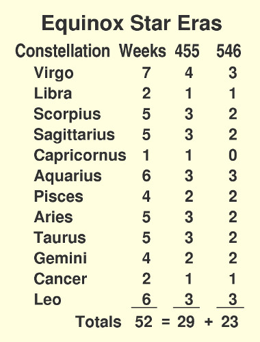 The result of dividing time into equinox star eras is shown in Table 2. The rows are divided according to the zodiac constellation. The first three columns identify the equinox star by the date of the zodiac month, astronomical designation, and English name. That name might be thought of as the name of the era. The next column lists the beginning date of the Star Calendar year (1 Vir) after inserting the extra week before it. Then the year (E) is listed to verify that it is always an equinox or solstice year, which makes it easy to know when the equinox star will change. Finally, the length of that era is listed. Note that they alternate between 455 and 546 years, beginning with 455 on day 1 of each constellation and moving upward through the constellation. For example, the first entry on 1 Gem is of length 455 because it is on the first day of that constellation. Similarly, 1 Tau, 1 Ari, and 1 Psc are also of length 455 years. This alternating results in 3 eras of 455 days and 2 of 546 in both Taurus and Aries. These numbers of 3 and 2 are seen in Table 1 in the rows for those constellations.