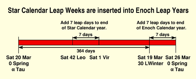 Figure 4 shows the manner in which inserting a typical leap week every few years into the Star Calendar is tied to the Enoch Calendar so that the same equinox star will be used every year during its own era. The year shown is a 364-day Enoch year starting on a Sat 20 Mar, being the Spring Equinox (E) on 0 Spring with the equinox star of Aldebaran (α Tau). It is an Enoch leap year, so there is an extra week added at the end of it, so that the next year begins on Sat 26 Mar being 0 Spring.