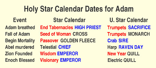 The key dates in the lives of Adam and Eve which were holy on other sacred calendars were usually also holy on the Star Calendars. To begin with, the day when Adam first breathed the breath of life was Tabernacles (E) and End Tabernacles (UE), both major holy days, but those Enoch years were not holy. On the Star Calendars that date was End Tabernacles in the year HIGH PRIEST (22 Sgr 28 AQR, S) and on Trumpets in the year SACRIFICE (1 Sco 2 CAP, US). Both of those years were minor holy years, being lunar mansions.[6] A date in ALL CAPITALS refers to a year rather than a day.