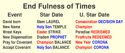 Thus, it is seen that many sacred events which have already occurred in the current End of the Fulness of Times have occurred on holy or meaningful dates on both Star Calendars. Several more are expected because we are still in the 7-year FEAST OF TABERNACLES (E). We live in exciting times which are rapidly bringing us to the final scenes of this age.