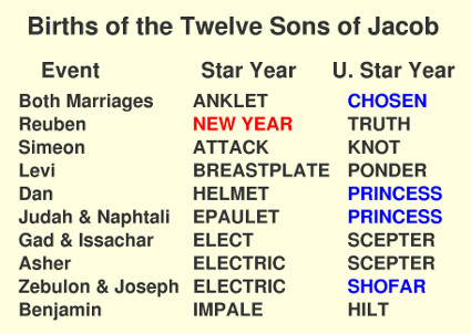 Their first twelve children were born during the next seven years, with each of the twelve sons being born in a different zodiac month. Those years on the Enoch Calendar were the seven years of PASSOVER (E), with Reuben born during the year EASTER (15 SPR) and Joseph born last during END PASSOVER (21 SPR). What were those years on the Star Calendars?