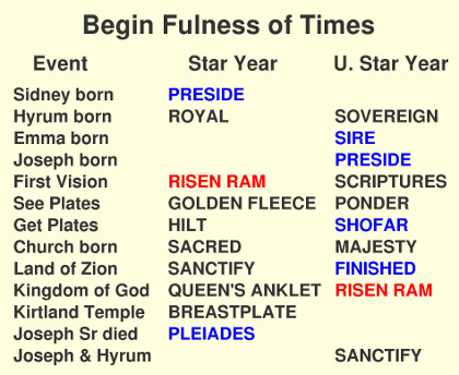 The birth star years of several of the early LDS leaders seem significant. Joseph the Seer was born during PRESIDE (ALP AND, 23 PSC, US), while his wife Emma was born during the previous year SIRE (DEL PEG, 22 PSC, US). Even those stars are in different constellations, they are both the same star (Alpheratz), which is a nice touch for a unified married couple. Hyrum Smith, his brother and Assistant President, was born during ROYAL (DEL AND, 30 PSC, S) and SOVEREIGN (EPS CEP, 17 PSC, US). Sidney Rigdon, the primary counselor and prophesied spokesman for Joseph Smith (2 Nephi 3:18), was born the year PRESIDE (ALP AND, 23 PSC, S), being the same year name as of Joseph's but on the other calendar.