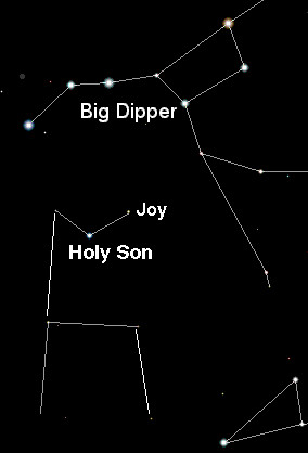 Just over a month ago a major revision was made to the Star Calendar. Three new rules were discovered which determine the precise order of the stars, which previously had been ordered only by longitude. One of those rules is that stars within an object must be on consecutive star days if they are close enough in longitude.[7] There are two "objects" in the Infant Prince: the mother and son. The reordering caused the two stars in the Infant to be moved slightly. The (hopefully) final correct ordering is that the star in the hand of the Infant (named Joy) was on the day before the conference, when some preliminary activities were held. The star day of the conference, from noon Saturday to noon Sunday, was the star named "Holy Son" in my work, the star at the heart of the Infant Prince! It is a fairly bright star which was identified in the fireside as "the heart of the Kingdom of God". The star is about as bright as those in the Big Dipper and it can be found near the center of the circle which would contain the Big Dipper handle (see Figure 6).