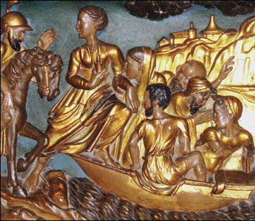 Tradition has it that, after the execution of St. James in Jerusalem (son of Zebedee and Mary Salome), Mary Magdalene, her sister Martha and brother Lazarus were persecuted by the Jews of Jerusalem and imprisoned. The Jews were afraid of the crowd if they were to execute the prisoners so they towed them off the shores of Palestine in a boat without sails or oars or supplies and abandoned them to the open sea. Others in the boat included Mary Jacobe, mother of [the apostle] James [the Less] and the sister of the Virgin Mary, Mary Salome, mother of the apostles James and John, Maximin, one of the seventy disciples of Christ, Cedonius, the blind man who was miraculously healed by Jesus, Marcelle, Martha's servant, and Sara, maid of the two Marys.