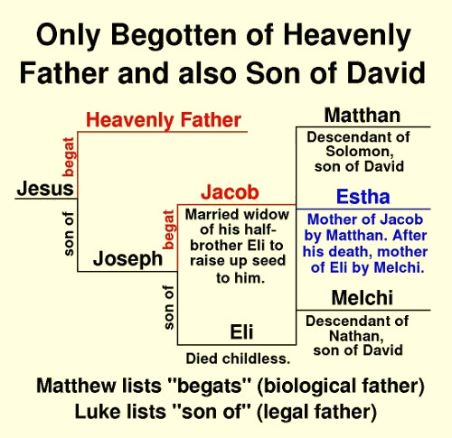 Fortunately, Luke provides us an answer to that difficult question. Joseph was a legal "son of David" in two different ways. There are two patriarchal genealogies of Joseph given in the New Testament, each provided for the express purpose of proving that Jesus was a son of David. Matthew gives the "begat" genealogy of the actual biological ancestry of Joseph back to King David through his son Solomon. Luke provides the legal ancestry of Joseph, to be a legal son of David through his son Nathan. It is Luke's version which gives us the clue. It shows that it was not necessary to be a biological descendant of David to be considered a "son". That is because Joseph was considered to be the son of Heli (Luke 2:23), but according to the early Church Fathers, Heli died childless! The biological father of Joseph was Jacob (Mat. 1:16), who was merely raising up seed to Heli (Greek for Eli).[11] Thus, Jesus was a legal "Son of David" because he was the legal son of Joseph, even though being the "Only Begotten" of Heavenly Father (see Figure 2). That apparently answers the tough question that Jesus posed. Note that in this case Jacob was the maternal half-brother of the deceased, so that the grandfathers of Joseph are different and trace up a long line all the way to David before they join!
