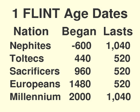 Because the periods of 520 years were considered particularly significant to the Toltecs, Table 1 list such periods all beginning with the year named 1 FLINT. The end of the Nahuatl civilization is listed as being in 440 because the Toltec Empire had not yet been founded and it was a transition time. The first year of the Nephites is listed in astronomical notation of AD -600 rather than the usual notation of 601 BC to more easily see that the length of their civilization was 1,040 years, being two 520-year periods. The Age of the Sacrificers refers to Chichimecs for the first half and Aztecs for the last half, but they were not listed separately to emphasize the importance of the 520-year ages.