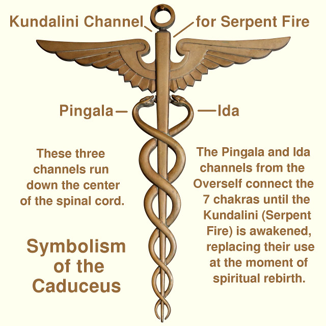 The illustration of the caduceus suggests that the moment a "spirit" is born, when the intelligence and psyche are united at the raising of the Serpent Fire (spiritual rebirth), is when the Ida and Pingala channels to the Overself are shut down at that time, making the new spirit formed from that union completely independent from the nurturing Overself.