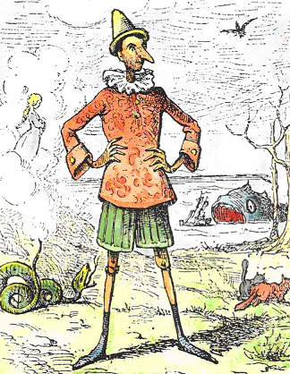 Pinocchio promises to attend school and Geppetto sells his only coat to buy him a school book. On his way to school he sells his book for a ticket to the marionette theater. He receives five gold pieces to take home to his father, but is conned out of them by a fox and a cat. A blackbird tries to warn him of their lies, but to no avail. Later as Pinocchio was passing the city of Catchfools, the fox and cat ambush and rob him, even though he was warned by the cricket's ghost. They hang him from a tree but he is rescued by a fairy with turquoise hair (actually the ghost of a recently deceased woman) who summoned a falcon to get him down. When he lies to the fairy about how he lost the gold coins, his nose grows long. The fairy explains that it grows when he lies.