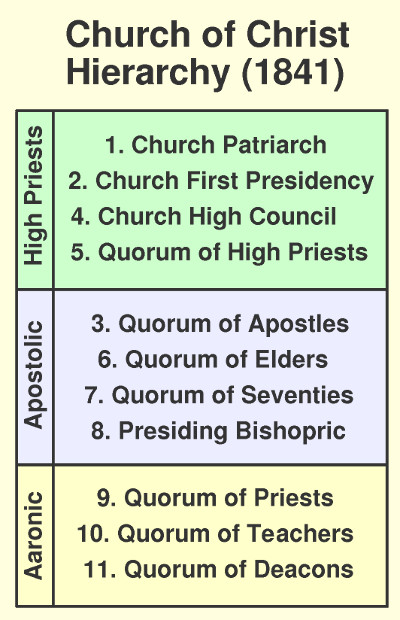 Table 1 shows the organizational hierarchy of the Church in 1841 according the Lord in D&C 124. Note that elders rank above seventies even though they both hold the same priesthood of apostles. The traveling seventies were ranked below the elders quorum presidency, even as the apostles were below the presiding high priests (First Presidency). When Elder Young immediately (Sept. 1844) had most elders ordained to be seventies, it produced a multitude of seventies, so several quorums were formed, each with seven presidents. Every stake had a seventies quorum up until 10 Oct 1986 when they were all merged into the elders quorums.[9] Thus, the Quorum of the Twelve took over the leadership of the Church, rather than being a Traveling Council to spread the gospel into new areas. Today, nearly every LDS high priest traces his priesthood lineage to one of the twelve apostles, so the sad news is that we have not had many true high priests in the LDS Church since that time.