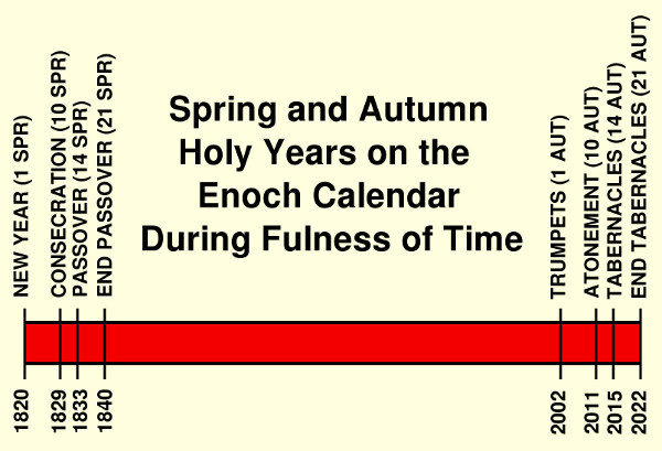 In earlier papers about sacred calendars, it was pointed out that this dispensation began with the opening of a new Enoch Great Year. In fact, the First Vision occurred on the opening day of this Great Year! A Great Year is a set of 364 years, each of which is named the same as the days of an Enoch Year. The principal holy days on both the Enoch and Hebrew Calendars fall into two groups, spring and autumn. There is a close correspondence between the two sets. On the Enoch Calendar, the spring days occur on day 1, 10, and 14-21 (Passover) in the first month (Spring) and the autumn holy days are on 1, 10, and 14-21 (Tabernacles) of the 7th month (Autumn). That means there is a set of 7 years which correspond to Passover week, which are called PASSOVER (all capitals meaning it refers to years, not days). Those seven years were from 1833 through 1840, counting years from the First Vision from 1 SPR (1820) to 14 SPR-21 SPR (see timeline illustration). That was indeed when many great revelations took place and included the years in Kirtland and the coming of the Lord to the temple there.