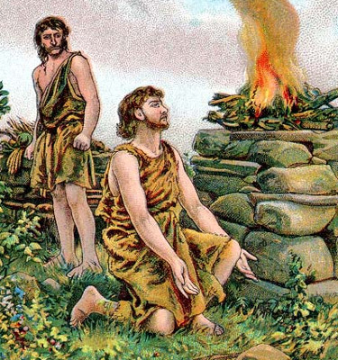 When this problem was pondered of whether Abel was a twin person or twin dog, the solution came from the Book of Enoch itself. There in one of the prophecies of the history of the world, the young bull representing Abel is given the color of red (the "red heifer" see Enoch 84:4, Num. 19:2). The color of the Twins' robes are red for the Warrior (Castor) and White for the Champion (Pollux). And sure enough, the Twin dressed in red is in Abel's (Sariel's) column. Therefore, it is proposed that Abel's constellation is that of the Western Twin, the Warrior.